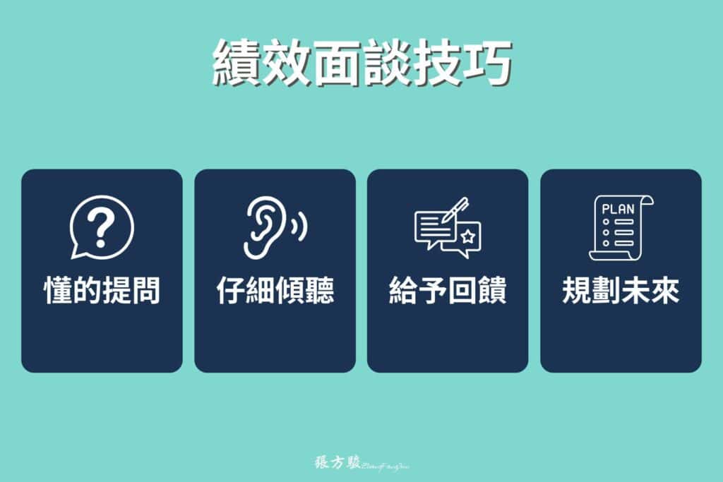 進行績效面談的時候,最重要的就是讓彼此溝通能夠順暢,因此有效且清晰的對話才是重點,不過在績效面談很多時候,員工都處於「聽」很少「說」,沒有建立信任也很難讓績效面談達到應有的目的,以下 4 個技巧